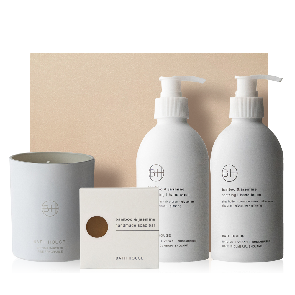 This set includes a hand wash, lotion, soap bar and soy wax candle, all fragranced with the crisp, green scent of Bamboo & Jasmine. A timeless gift, expressing care and refinement through natural simplicity.